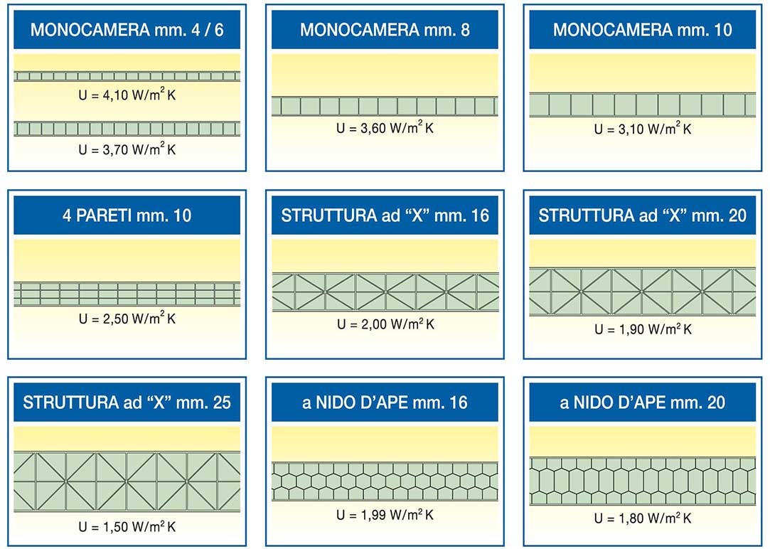 mm. 20 a nido d’ape oppure con spessore mm. 30 e 40 con alveolo a 5 camere.